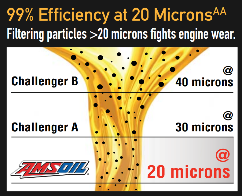 Efficiency is a filter’s ability to capture contaminants. The more efficient a filter is, the more contaminants it will remove from oil. AMSOIL Oil Filters provide a filtering efficiency in accordance with industry standard ISO 4548-12 of 99 percent at 20 microns – one of the best ratings on the market. Some competitors also claim 99 percent efficiency, but at larger particle sizes of 30 to 40 microns.