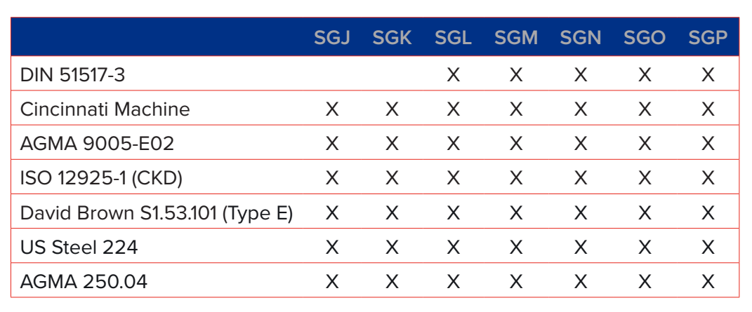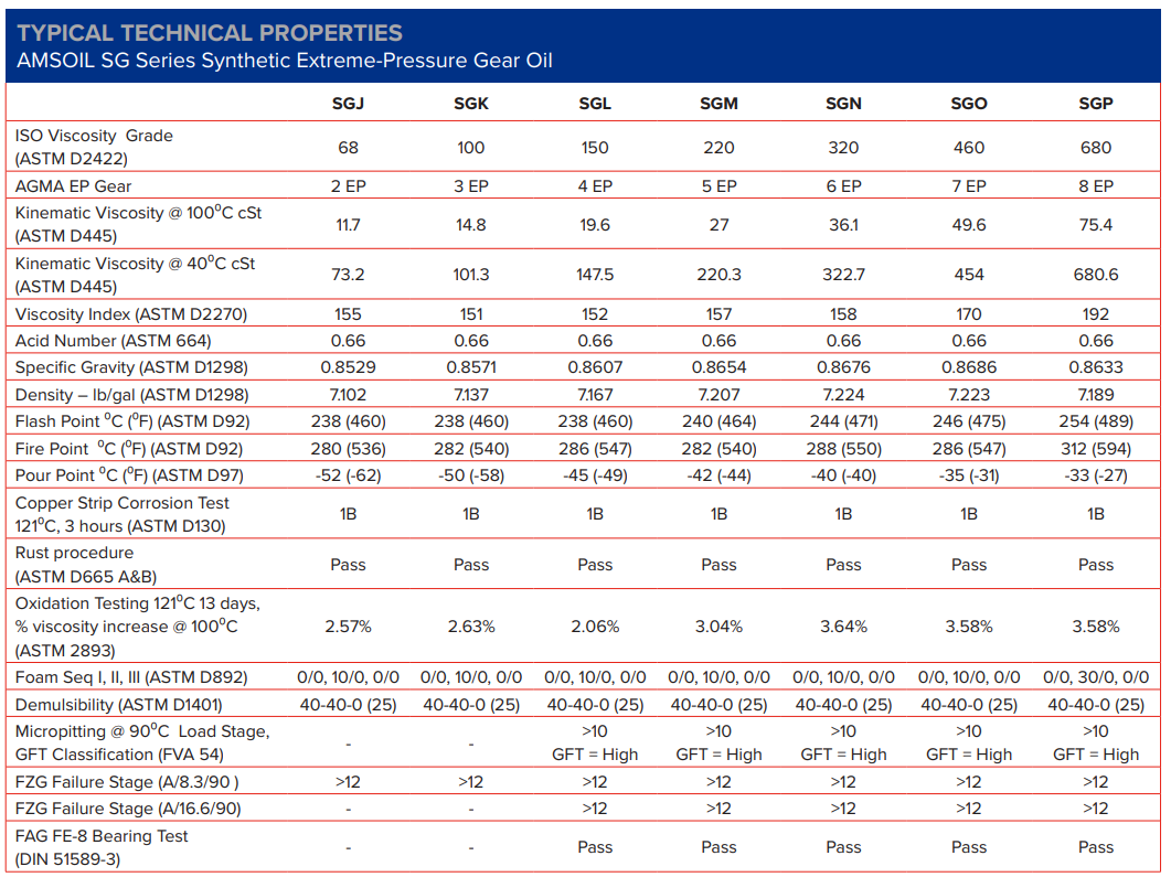 The appropriate viscosity grade of AMSOIL SG Series Synthetic EP Gear Oil is recommended for applications requiring any of the following specifications: